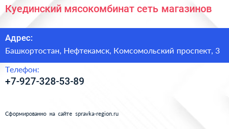 Куединский мясокомбинат, сеть магазинов по адресу Башкортостан, Нефтекамск, Комсомольский проспект, 3 в дальнейшем Организация, размещена в следующих категориях: