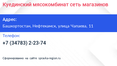Куединский мясокомбинат, сеть магазинов по адресу Башкортостан, Нефтекамск, улица Чапаева, 11 в дальнейшем Организация, размещена в следующих категориях: