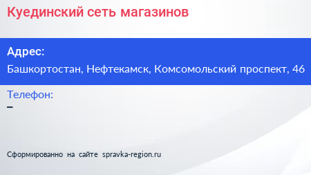 Куединский, сеть магазинов по адресу Башкортостан, Нефтекамск, Комсомольский проспект, 46 в дальнейшем Организация, размещена в следующих категориях: