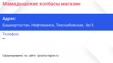 Мамадышские колбасы, магазин по адресу Башкортостан, Нефтекамск, Техснабовская, 3е/1 в дальнейшем Организация, размещена в следующих категориях: