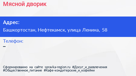 Мясной дворик по адресу Башкортостан, Нефтекамск, улица Ленина, 58 в дальнейшем Организация, размещена в следующих категориях: