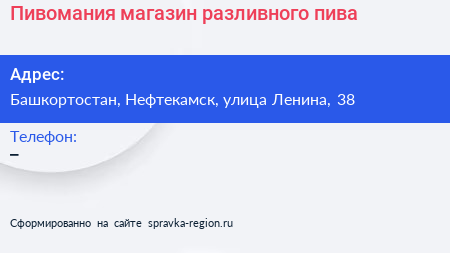 Пивомания, магазин разливного пива по адресу Башкортостан, Нефтекамск, улица Ленина, 38 в дальнейшем Организация, размещена в следующих категориях: