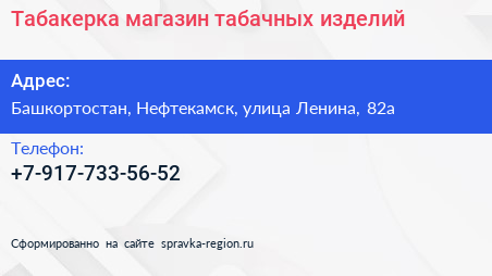 Табакерка, магазин табачных изделий по адресу Башкортостан, Нефтекамск, улица Ленина, 82а в дальнейшем Организация, размещена в следующих категориях: