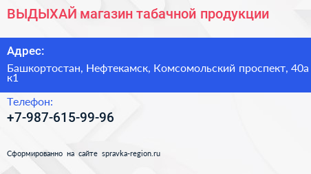 ВЫДЫХАЙ, магазин табачной продукции по адресу Башкортостан, Нефтекамск, Комсомольский проспект, 40а к1 в дальнейшем Организация, размещена в следующих категориях: