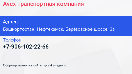 Avex, транспортная компания по адресу Башкортостан, Нефтекамск, Берёзовское шоссе, 3а в дальнейшем Организация, размещена в следующих категориях: