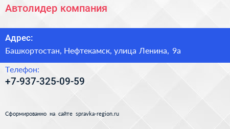 Автолидер, компания по адресу Башкортостан, Нефтекамск, улица Ленина, 9а в дальнейшем Организация, размещена в следующих категориях: