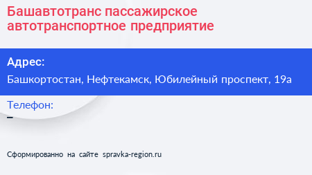 Башавтотранс, пассажирское автотранспортное предприятие по адресу Башкортостан, Нефтекамск, Юбилейный проспект, 19а в дальнейшем Организация, размещена в следующих категориях: