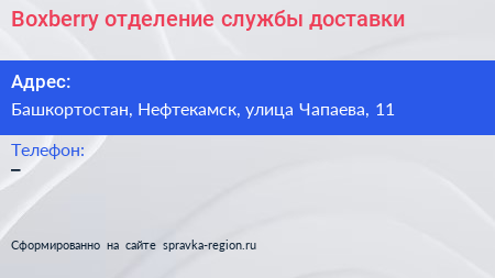 Boxberry, отделение службы доставки по адресу Башкортостан, Нефтекамск, улица Чапаева, 11 в дальнейшем Организация, размещена в следующих категориях: