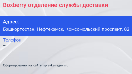 Boxberry, отделение службы доставки по адресу Башкортостан, Нефтекамск, Комсомольский проспект, 82 в дальнейшем Организация, размещена в следующих категориях: