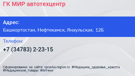 ГК МИР, автотехцентр по адресу Башкортостан, Нефтекамск, Янаульская, 12Б в дальнейшем Организация, размещена в следующих категориях: