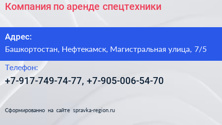 Компания по аренде спецтехники по адресу Башкортостан, Нефтекамск, Магистральная улица, 7/5 в дальнейшем Организация, размещена в следующих категориях: