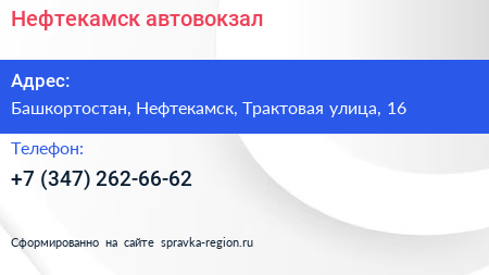 Нефтекамск, автовокзал по адресу Башкортостан, Нефтекамск, Трактовая улица, 16 в дальнейшем Организация, размещена в следующих категориях: