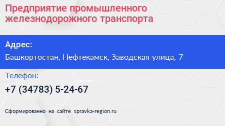 Предприятие промышленного железнодорожного транспорта по адресу Башкортостан, Нефтекамск, Заводская улица, 7 в дальнейшем Организация, размещена в следующих категориях: