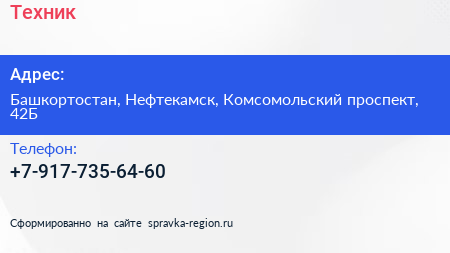 Техник по адресу Башкортостан, Нефтекамск, Комсомольский проспект, 42Б в дальнейшем Организация, размещена в следующих категориях: