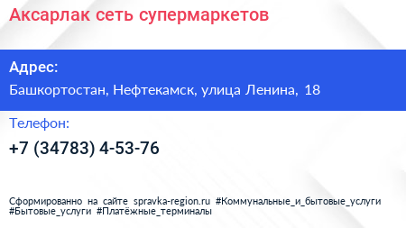 Аксарлак, сеть супермаркетов по адресу Башкортостан, Нефтекамск, улица Ленина, 18 в дальнейшем Организация, размещена в следующих категориях: