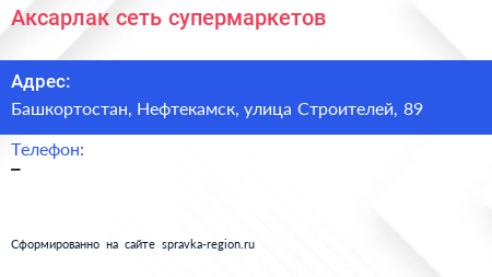 Аксарлак, сеть супермаркетов по адресу Башкортостан, Нефтекамск, улица Строителей, 89 в дальнейшем Организация, размещена в следующих категориях: