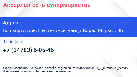 Аксарлак, сеть супермаркетов по адресу Башкортостан, Нефтекамск, улица Карла Маркса, 8Б в дальнейшем Организация, размещена в следующих категориях: