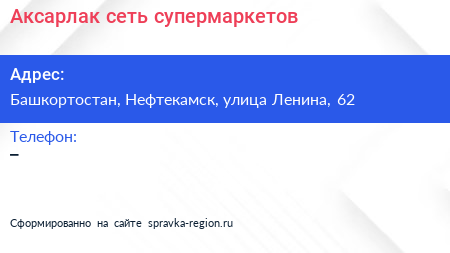 Аксарлак, сеть супермаркетов по адресу Башкортостан, Нефтекамск, улица Ленина, 62 в дальнейшем Организация, размещена в следующих категориях: