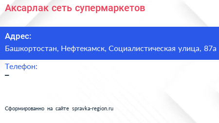 Аксарлак, сеть супермаркетов по адресу Башкортостан, Нефтекамск, Социалистическая улица, 87а в дальнейшем Организация, размещена в следующих категориях: