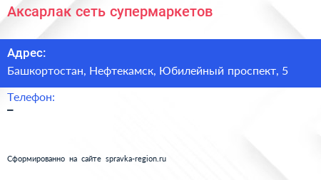 Аксарлак, сеть супермаркетов по адресу Башкортостан, Нефтекамск, Юбилейный проспект, 5 в дальнейшем Организация, размещена в следующих категориях: