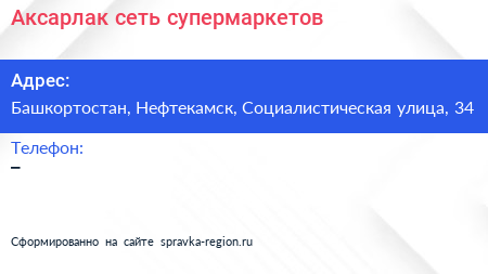 Аксарлак, сеть супермаркетов по адресу Башкортостан, Нефтекамск, Социалистическая улица, 34 в дальнейшем Организация, размещена в следующих категориях: