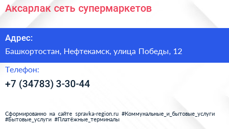 Аксарлак, сеть супермаркетов по адресу Башкортостан, Нефтекамск, улица Победы, 12 в дальнейшем Организация, размещена в следующих категориях: