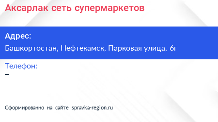 Аксарлак, сеть супермаркетов по адресу Башкортостан, Нефтекамск, Парковая улица, 6г в дальнейшем Организация, размещена в следующих категориях: