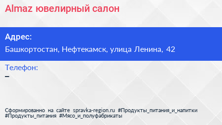 Almaz, ювелирный салон по адресу Башкортостан, Нефтекамск, улица Ленина, 42 в дальнейшем Организация, размещена в следующих категориях: