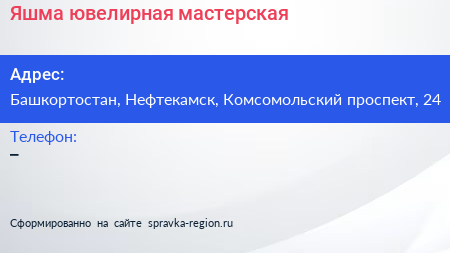 Яшма, ювелирная мастерская по адресу Башкортостан, Нефтекамск, Комсомольский проспект, 24 в дальнейшем Организация, размещена в следующих категориях: