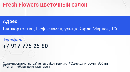 Fresh Flowers, цветочный салон по адресу Башкортостан, Нефтекамск, улица Карла Маркса, 10г в дальнейшем Организация, размещена в следующих категориях: