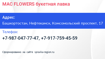 MAC FLOWERS, букетная лавка по адресу Башкортостан, Нефтекамск, Комсомольский проспект, 17 в дальнейшем Организация, размещена в следующих категориях: