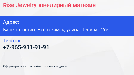 Rise Jewelry, ювелирный магазин по адресу Башкортостан, Нефтекамск, улица Ленина, 19е в дальнейшем Организация, размещена в следующих категориях: