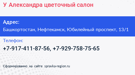 У Александра, цветочный салон по адресу Башкортостан, Нефтекамск, Юбилейный проспект, 13/1 в дальнейшем Организация, размещена в следующих категориях:
