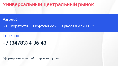 Универсальный центральный рынок по адресу Башкортостан, Нефтекамск, Парковая улица, 2 в дальнейшем Организация, размещена в следующих категориях: