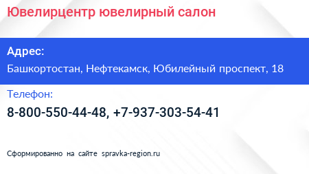 Ювелирцентр, ювелирный салон по адресу Башкортостан, Нефтекамск, Юбилейный проспект, 18 в дальнейшем Организация, размещена в следующих категориях: