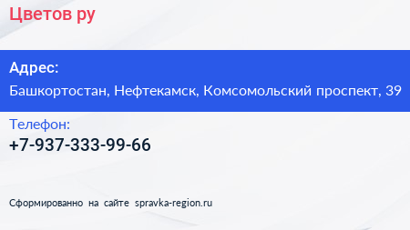 Цветов.ру по адресу Башкортостан, Нефтекамск, Комсомольский проспект, 39 в дальнейшем Организация, размещена в следующих категориях: