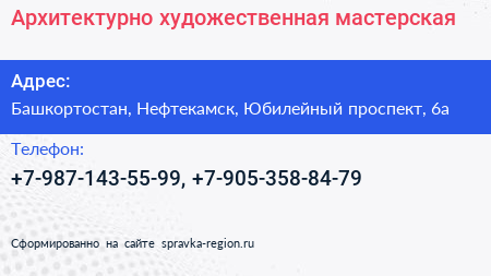 Архитектурно-художественная мастерская по адресу Башкортостан, Нефтекамск, Юбилейный проспект, 6а в дальнейшем Организация, размещена в следующих категориях: