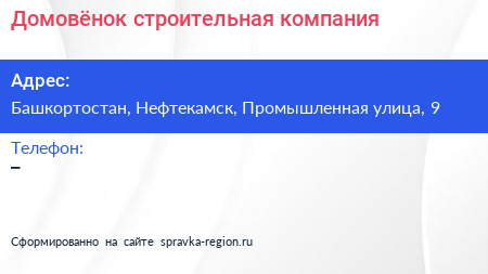 Домовёнок, строительная компания по адресу Башкортостан, Нефтекамск, Промышленная улица, 9 в дальнейшем Организация, размещена в следующих категориях: