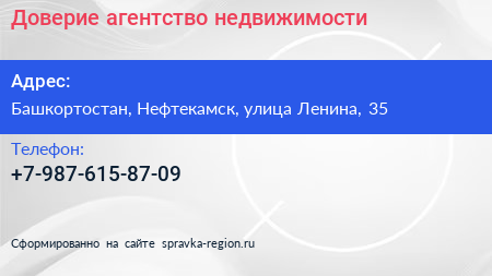 Доверие, агентство недвижимости по адресу Башкортостан, Нефтекамск, улица Ленина, 35 в дальнейшем Организация, размещена в следующих категориях: