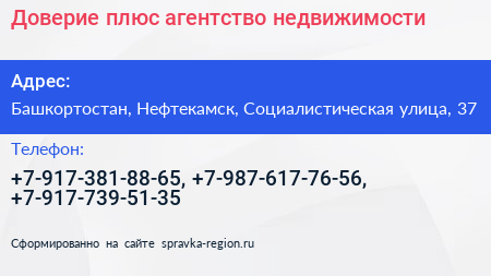 Доверие плюс, агентство недвижимости по адресу Башкортостан, Нефтекамск, Социалистическая улица, 37 в дальнейшем Организация, размещена в следующих категориях: