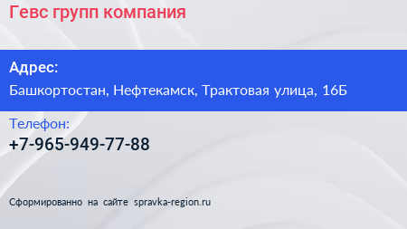 Гевс групп, компания по адресу Башкортостан, Нефтекамск, Трактовая улица, 16Б в дальнейшем Организация, размещена в следующих категориях: