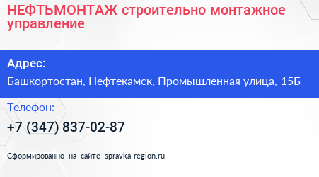 НЕФТЬМОНТАЖ, строительно-монтажное управление по адресу Башкортостан, Нефтекамск, Промышленная улица, 15Б в дальнейшем Организация, размещена в следующих категориях: