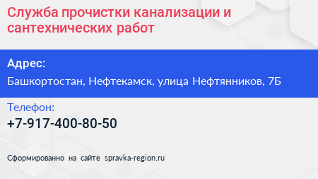 Служба прочистки канализации и сантехнических работ по адресу Башкортостан, Нефтекамск, улица Нефтянников, 7Б в дальнейшем Организация, размещена в следующих категориях: