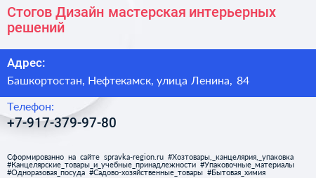 Стогов Дизайн, мастерская интерьерных решений по адресу Башкортостан, Нефтекамск, улица Ленина, 84 в дальнейшем Организация, размещена в следующих категориях: