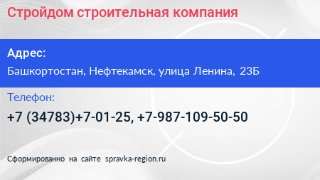 Стройдом, строительная компания по адресу Башкортостан, Нефтекамск, улица Ленина, 23Б в дальнейшем Организация, размещена в следующих категориях: