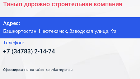 Танып, дорожно-строительная компания по адресу Башкортостан, Нефтекамск, Заводская улица, 9а в дальнейшем Организация, размещена в следующих категориях: