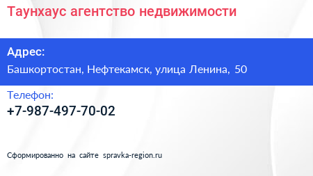 Таунхаус, агентство недвижимости по адресу Башкортостан, Нефтекамск, улица Ленина, 50 в дальнейшем Организация, размещена в следующих категориях: