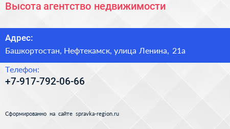 Высота, агентство недвижимости по адресу Башкортостан, Нефтекамск, улица Ленина, 21а в дальнейшем Организация, размещена в следующих категориях: