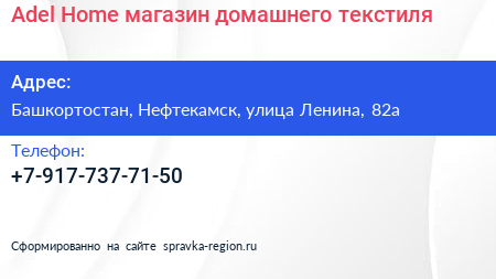 Adel Home, магазин домашнего текстиля по адресу Башкортостан, Нефтекамск, улица Ленина, 82а в дальнейшем Организация, размещена в следующих категориях: