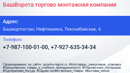 БашВорота, торгово-монтажная компания по адресу Башкортостан, Нефтекамск, Техснабовская, 6 в дальнейшем Организация, размещена в следующих категориях: